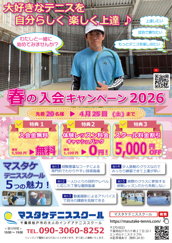 千葉県松戸市の大人のインドアテニススクールならマスタケテニススクールへ